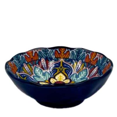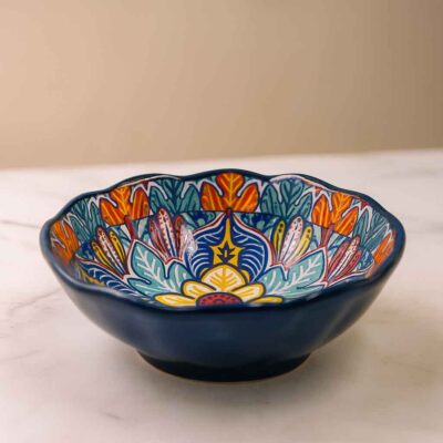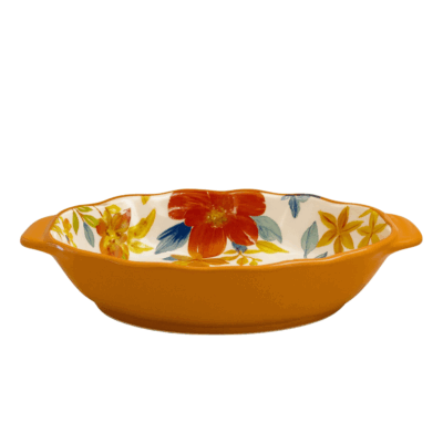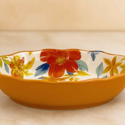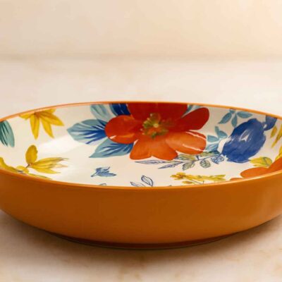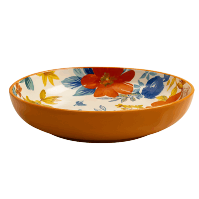 Bowl de cerámica con exterior naranjo cálido e interior con diseño floral multicolor. Perfecto para servir ensaladas, pastas o snacks, aportando un toque alegre y acogedor a la mesa sin perder elegancia.