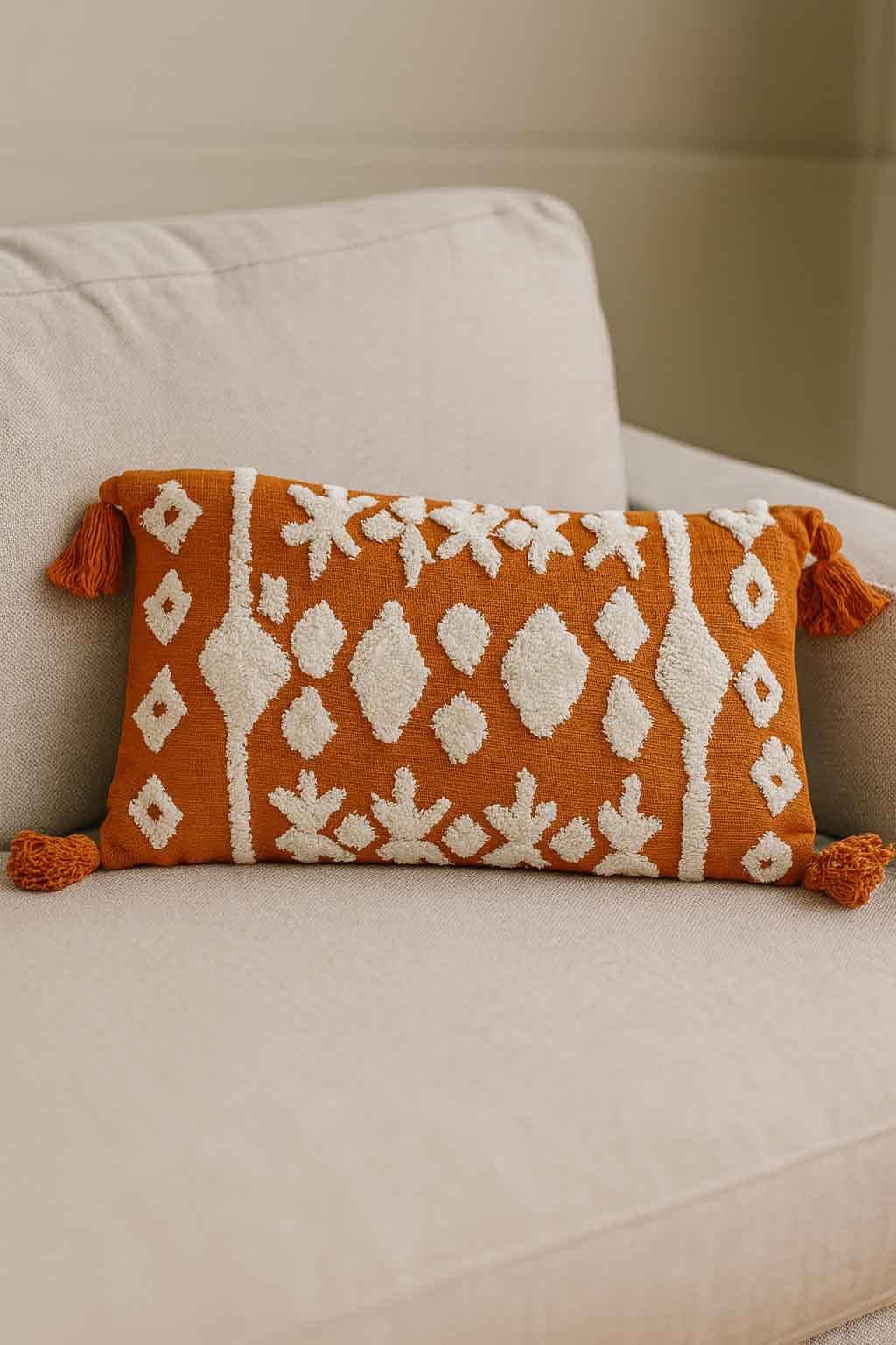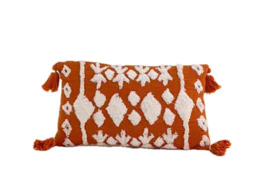 Cojín decorativo rectangular en tono naranjo terracota con diseño étnico en relieve blanco y borlas en las esquinas. Aporta un toque acogedor y con carácter a sofás, sillones o camas, combinando calidez y estilo artesanal en la decoración del hogar.