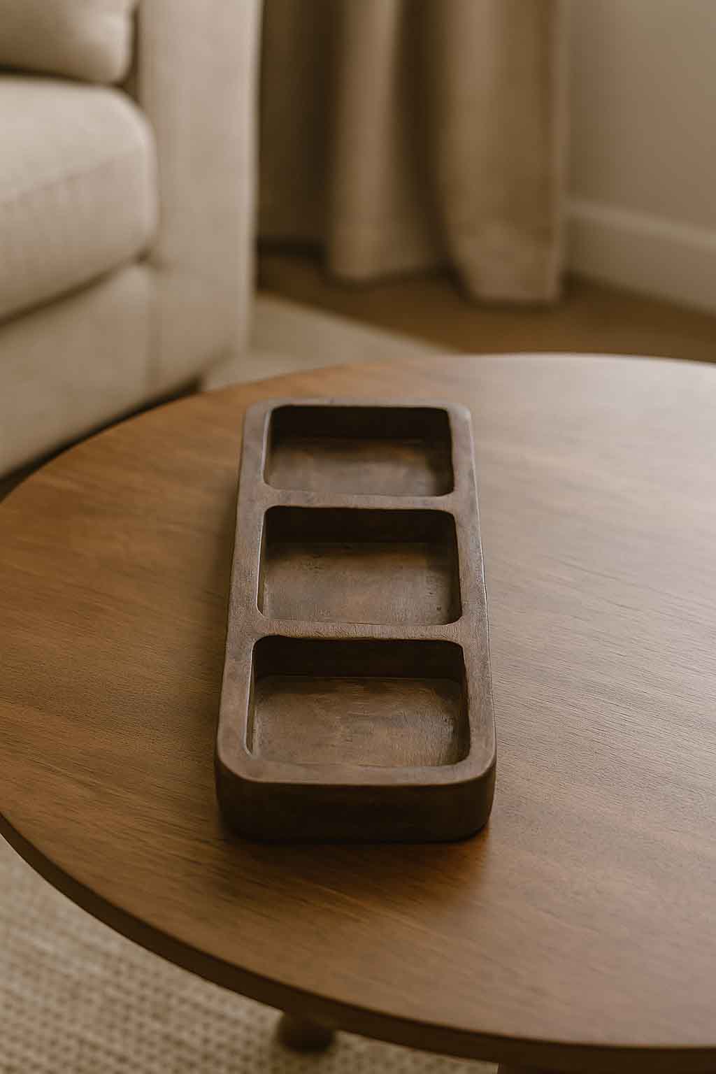 Plato triple de madera con tres compartimentos ideales para snacks, frutos secos o salsas. Su diseño sencillo y funcional aporta un toque cálido y versátil a la mesa, perfecto para compartir en reuniones familiares o con amigos.