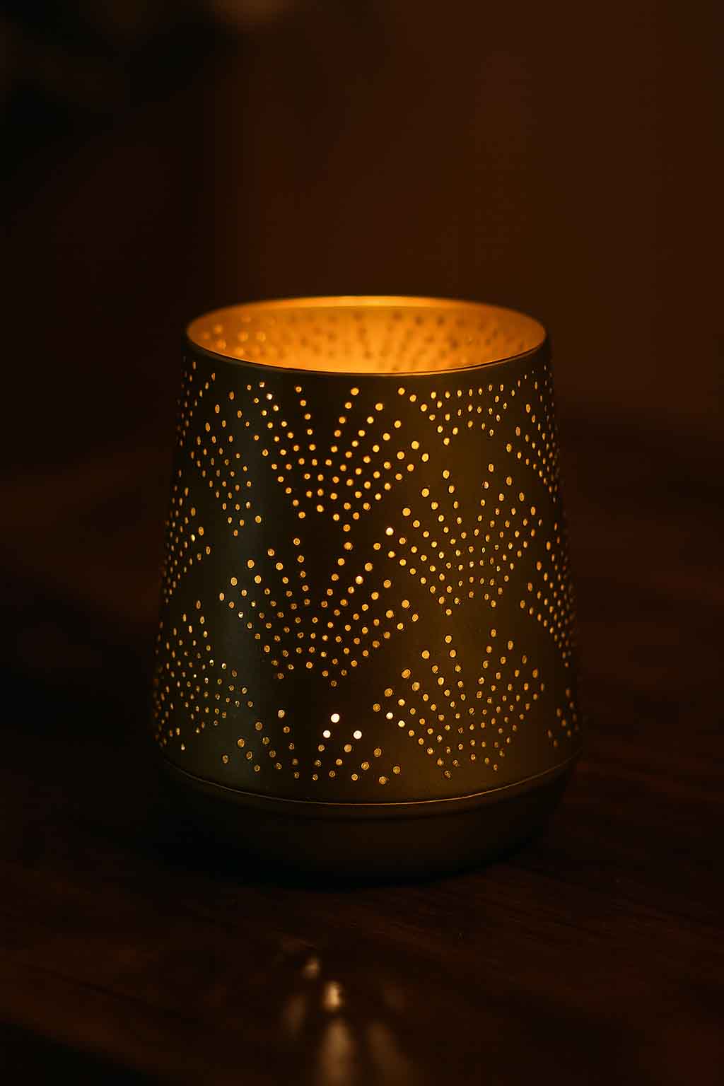 Portavelas metálico en tono oro envejecido con diseño calado que proyecta un juego de luces suave y acogedor al encender una vela. Ideal para mesas, repisas o terrazas, aportando un toque cálido y decorativo a cualquier espacio.
