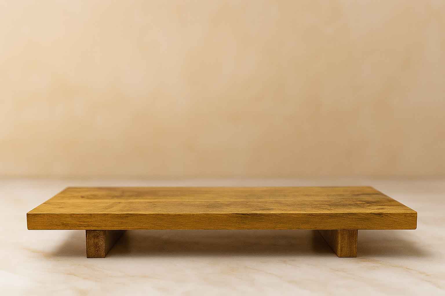 Bandeja decorativa de madera con diseño rectangular y base elevada. Ideal para organizar y exhibir objetos, servir aperitivos o usar como centro de mesa, aportando un toque natural y acogedor a la decoración del hogar.